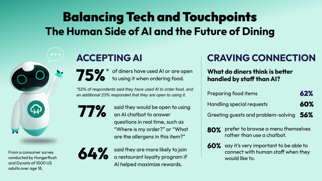 From voice ordering to predictive loyalty programs, AI is already reshaping how guests order, pay, and engage in dining experiences. But according to new HungerRush data, diners don’t want a robotic restaurant experience. They want AI that makes dining easier and faster — without losing the human touch.