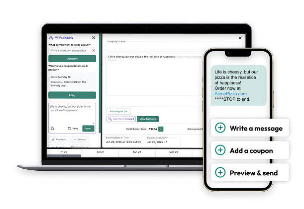 From a rainy-day lunch special to a last-minute event, launch a text campaign in minutes. If you can text, you can increase sales.