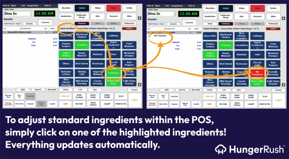 The HungerRush POS takes away the guesswork on both ends of the ordering operation with smart visual design. When an order comes in, the screen clearly shows the order taker what ingredients normally come on that item—highlighted in green—and what’s available for modification.
